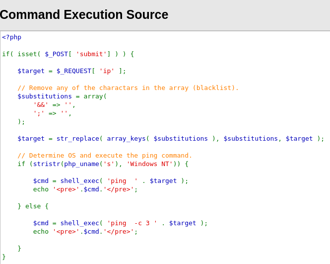 DVWA의 Command Execution 페이지에서 Medium 보안 설정으로 되어 있을 때, 소스 코드를 살펴보면 명령어 주입을 방지하기 위해 세미콜론(;)과 앰퍼샌드(&) 문자를 필터링하고 있음을 알 수 있습니다. 하지만, 우리는 여전히 이 필터를 우회할 수 있는 방법을 찾아야 합니다.