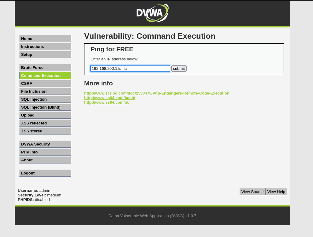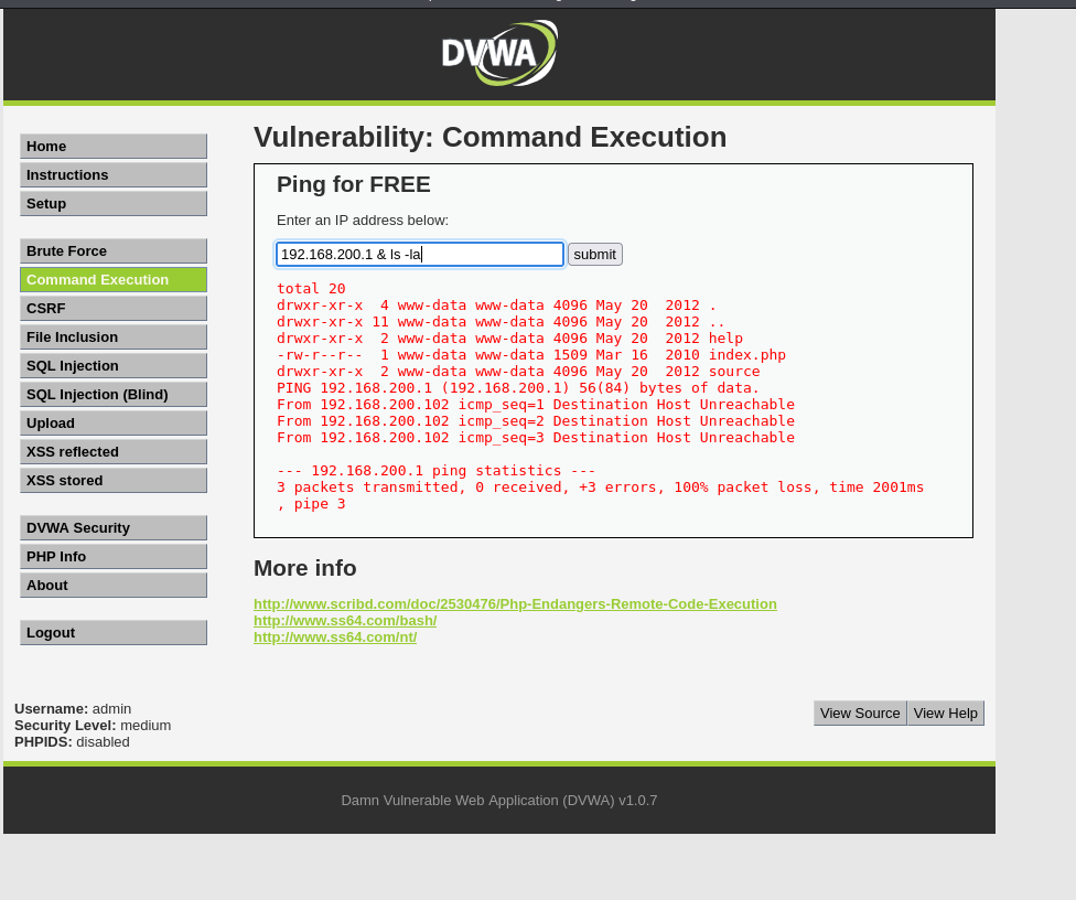 이번에는 DVWA (Damn Vulnerable Web Application)에서 Command Execution 취약점을 Medium 보안 설정 상태에서 해킹하는 방법을 살펴보겠습니다. Low 단계에서 사용했던 방식은 통하지 않으며, 이에 따라 다른 방법을 시도해야 합니다.
