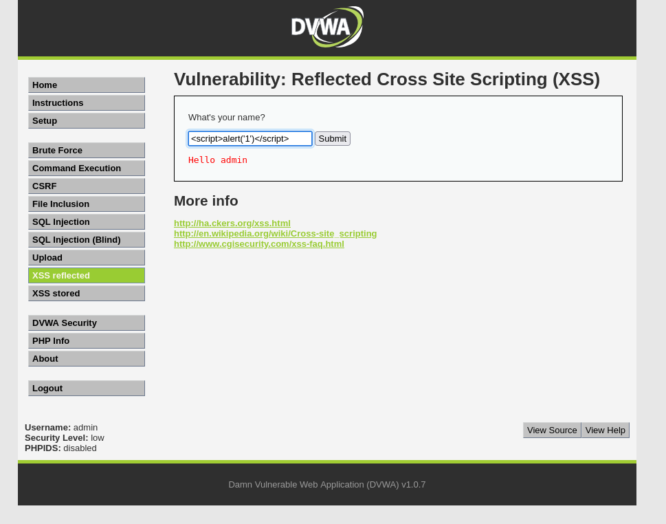 DVWA의 XSS Reflected -- LOW 수준에서 공격을 시도해보겠습니다. 처음 화면은 사용자에게 이름을 묻는 입력란이 있고, 입력된 이름이 출력되는 형태입니다.