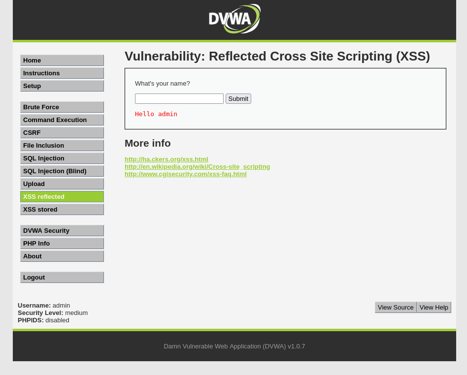 DVWA의 XSS Reflected -- MEDIUM 수준에서 공격을 시도해보겠습니다. 처음 화면은 사용자에게 이름을 묻는 입력란이 있고, 입력된 이름이 출력되는 형태입니다.